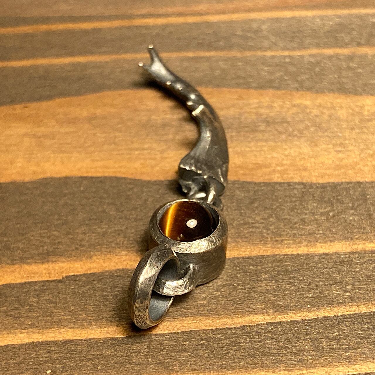 石台には、虎の目の虹彩を連想させる金褐色の模様が美しい鉱石をセットしました。